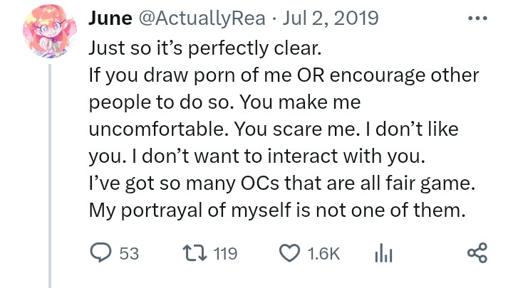 >>9126464Nuh uh I've no demands for this thread other than don't use it as a hub to harrass and stalk me and boast that you're in my discord server etc etc etcAlso are we now finding out emberbaye is absolutely insufferable? I warned you lot long ago. He was banned from my server because he thought he was entitled to sexually harassing me, and then attempted to frame me as a scammer, cause I wouldn't pay up for a drawing that he finished without my consent and posted as "fan art". It's a new low to literally crash out over a THREAD IMAGE LOL