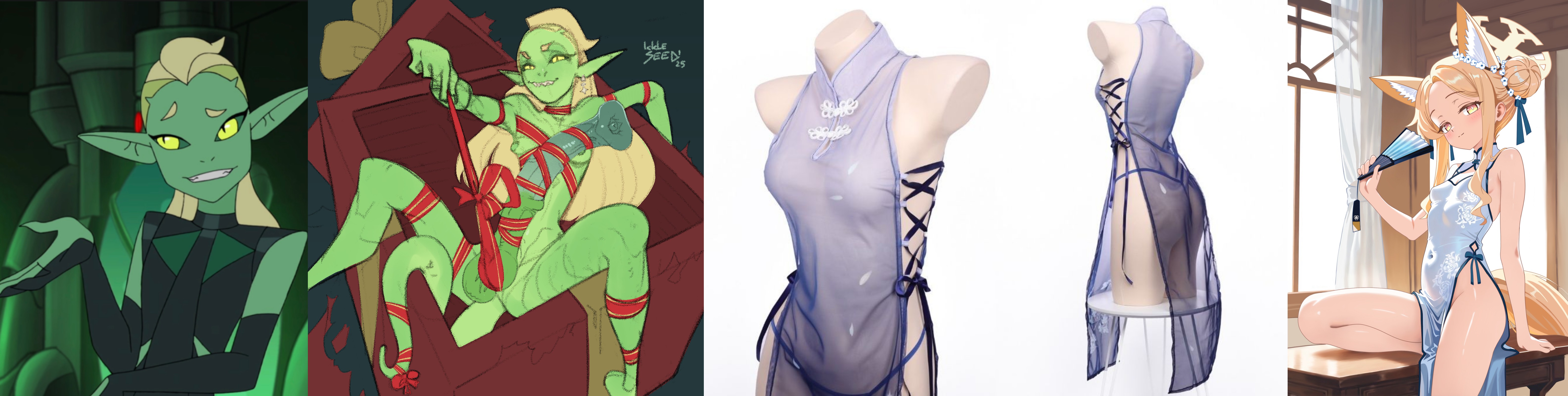 Requesting femboy Double Trouble wearing a see through qi pao holding a fan like the girl on the right with a massive horse cock sticking out from underneath the dress, winking and wishing you a happy year of the horse