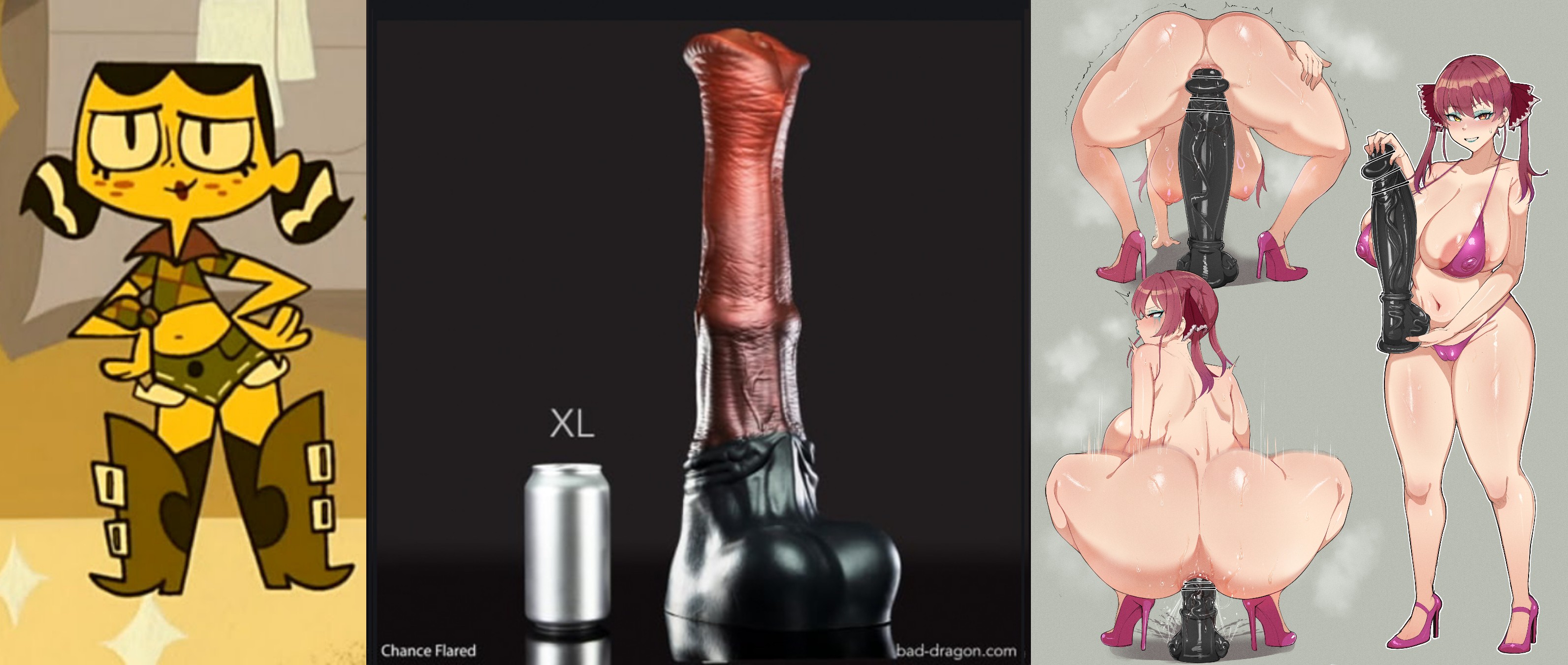 Requesting the right pic with Tiff Crust wearing the outfit she is wearing on the left riding a horse cock dildo