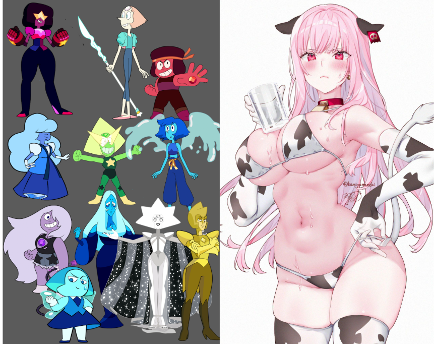 Requesting a very hung anon posing with a harem of gems wearing cow print bikinis