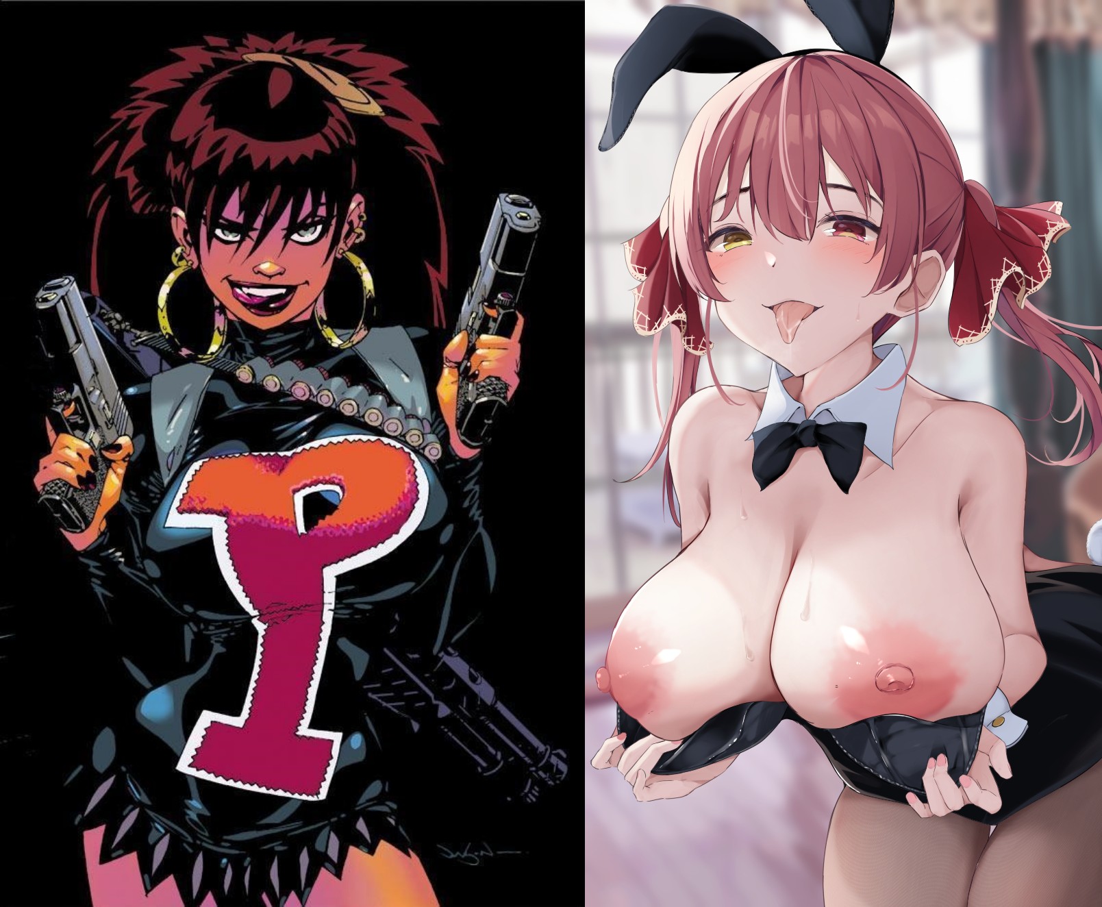 Requesting a nude pinup of BW posing like the right image with revolvers, wearing a hat and face mask like she's wearing in the left photo.