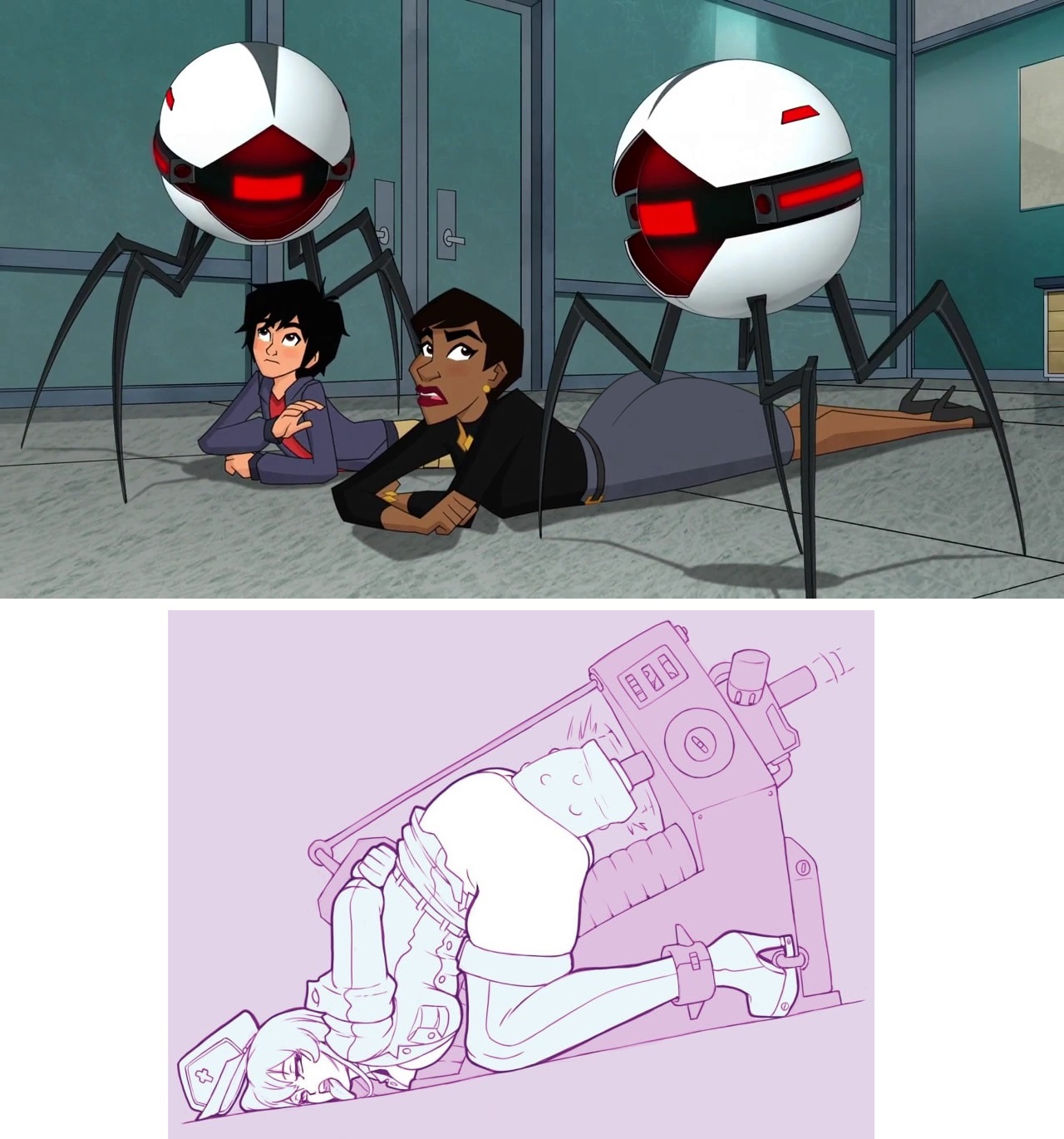 Requesting Professor Granville, from the BH6 series, getting fucked as she is, prone bone, by that robot. Give the robot a rubber robo-cock.