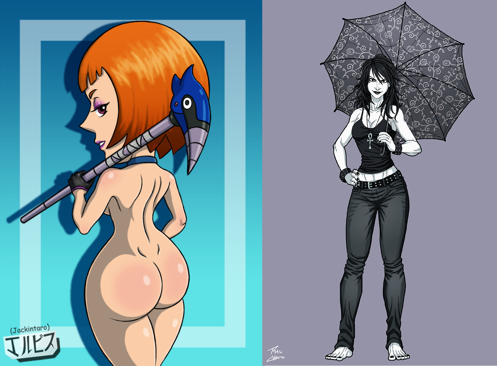 >>9143288Requesting Girl-Ben & Girl-Albedo doing like in the right. Non-nude, but with G-Ben bottomless and G-Albedo with her swimsuit to the side.