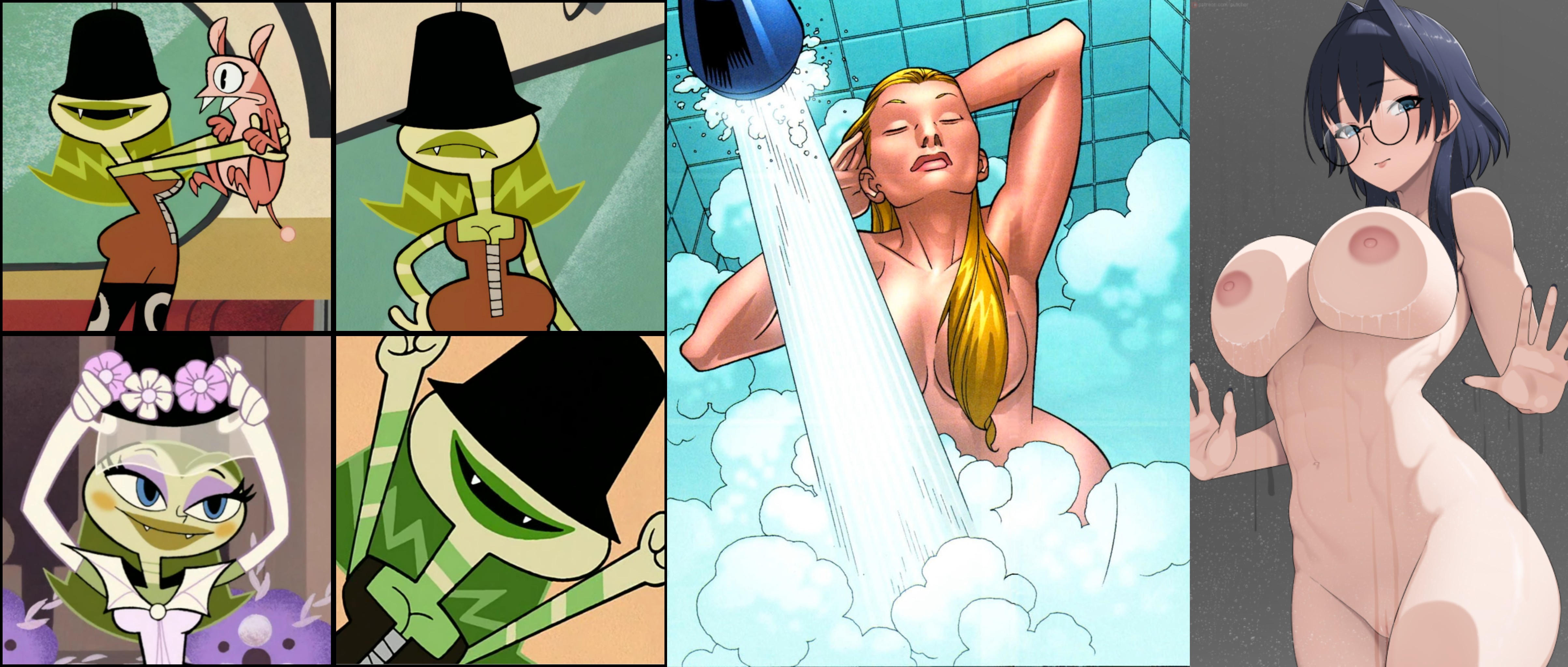 Requesting Megara, Pain, and Panic showering together. Panic washing her boobs, and Pain washing her pussy or ass