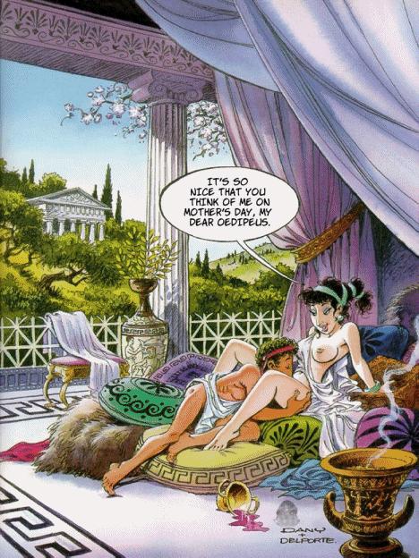 It's a comedy picture showing a greek man eating out a greek woman pussy, in a stereotypical mythological landscape. The caption is in french. It's the half-naked woman saying " It's nice you did remember mother's day, my dear little Oedipus"