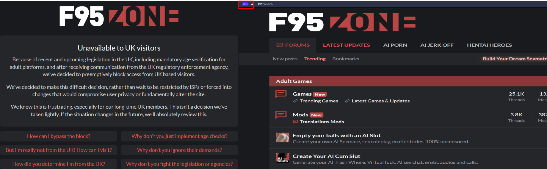 ESL95 about to institute it's block against my country. I've managed to download 60 wegs, I would estimate over half of them are full completed Wegs or long enough that they might as well be completed, the rest are wip's wegs that I'm very fond of but haven't been updated for a while or probably won't be.Not sure if VPN will work for me after the block because my country is going full fucking puritanical, they're even wanting to make vpn's illegal for fuck sake. Until then I'll have to rely on one to continue my romance wegs.About to start playing Imperial Chronicles. You want to know the funny thing? I have a few Wegs on Steam that I'm not blocked from, had to use my CC to age verify which fucking sucks but they let me continue on whereas ESL95 is instituting a full on IP range block, no option to age verify. So I'm fucked. Fucking Steam is allowing me to continue viewing Wegs/ porn games over a fucking Pirate website. How fucked up is this?