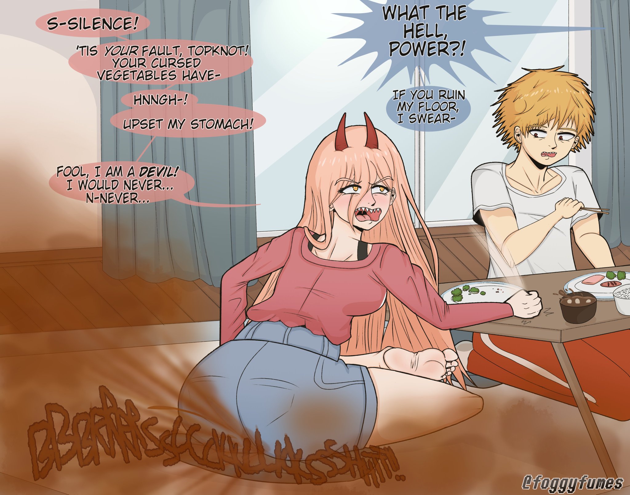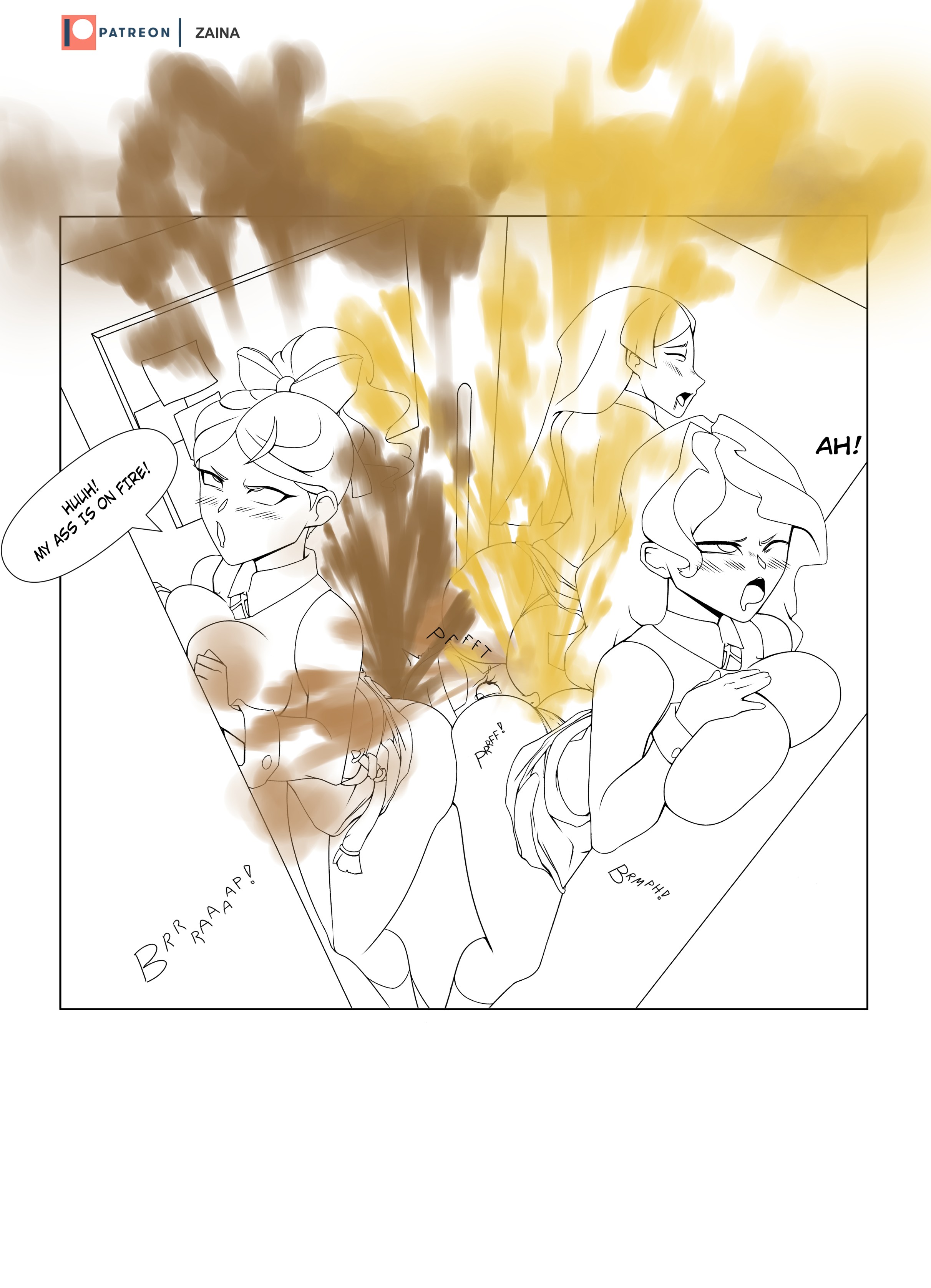 almost none of this is hot to me because of all the gas clouds. this is not what real farting looks like... there are subtler and more sensual ways to draw a fart that you pretty much only find in doujins. really perplexing why "gigantic cloud of green/brown smoke" is the meta here