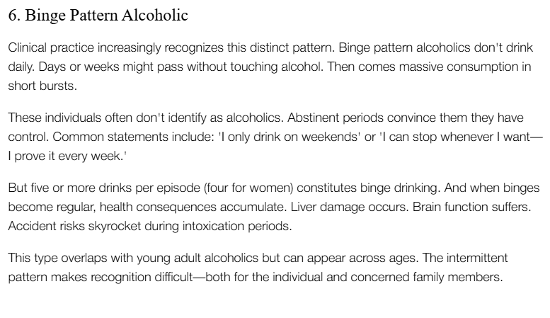 >>34318335Your alcoholic profile would be of the binge variety. I used to be like this up until March 2020, the lockdowns and then I went heavy every day. until maybe 2022 but I'm still pretty bad with it whenever I do. All it will take anon is one bad even or trigger and your binge patterns could escalate to everyday drinking.
