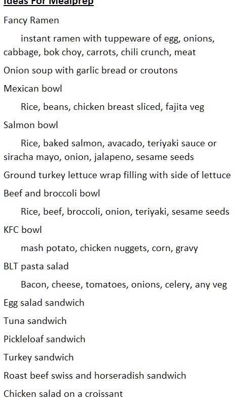 In the morning, hot cereal, yogurt with granola, boiled eggs and an apple, a protein smoothieFor lunch you could bring like basic cheese and crackers or more involved stuff like picrel that's from my lunch idea list you might find some inspo. I eat pretty balancedWhen I fall into a rut I google shit like 100 lunch ideas sometimes I forget I like stuff and go oh yeah