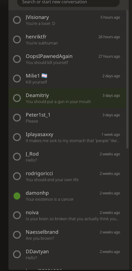 >those messagesHoly shit, is internet chess really that hardcore? Fucking brutal lmaoanyway OP, don't worry about it. I play chess sometimes, my W/L is about 60/40 and I don't worry about it because it's just a fun game. If you're trying to make a career out of it, well, then you need to learn how to deal with the abuse because it's always gonna be like that in competitive stuff. but if you just like playing chess, then just have fun with it and don't worry so much