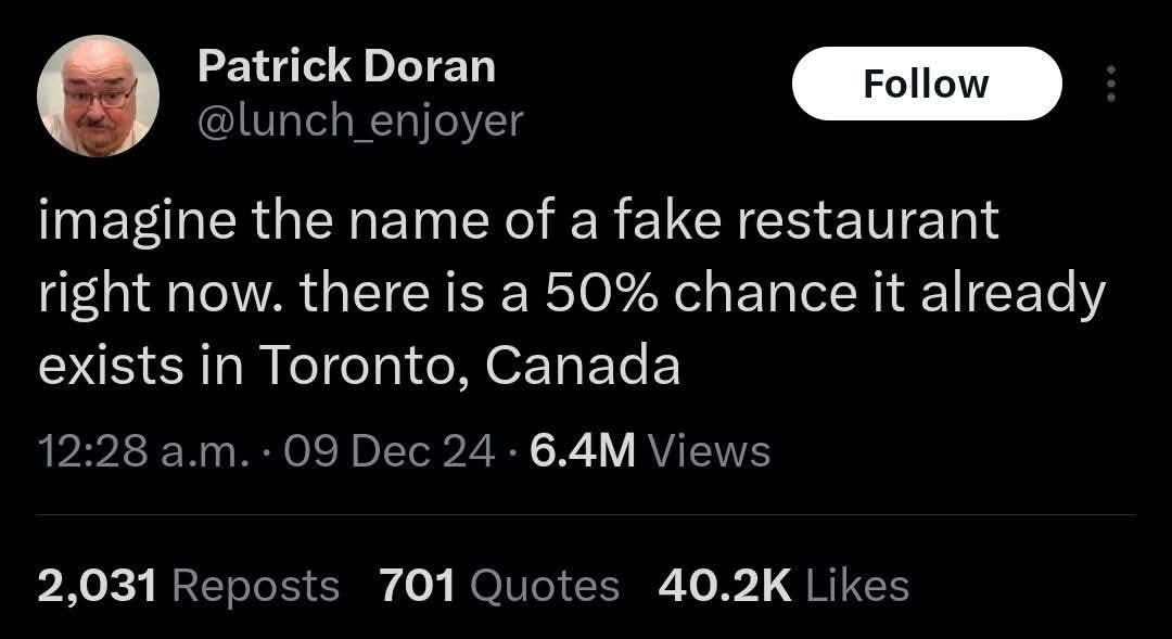 Gender, can you come up with a sily restaraunt name? Torontofags, can you tell us if it does exist?