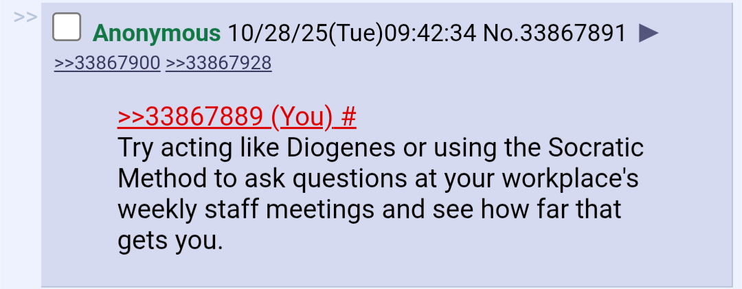 >>33867880>I'm in my mid-30s and nowhere near as weird about my role in this recurring thread as you try to be.My role? I consider my role to post good advice, funny posts, and correct idiots spreading misinformation, because I choose to.I don't see how I am weird about it. I simply can examine and explain myself.>>33867876>>Plus a lot of my advice is universal.>No, usually it's just another subjective opinionDisagree, well sometimes it is opinion and sometimes it's objective fact. But that's irrelevant. It is *still* universal. As in it could be applied by anyone in any situation, whether or not you agree with it, it's still universal.>and sometimes you've been caught in outright lies.Meh. Being imprecise or saying two things at two different times that conflict with each other in some way isn't exactly "getting caught lying".