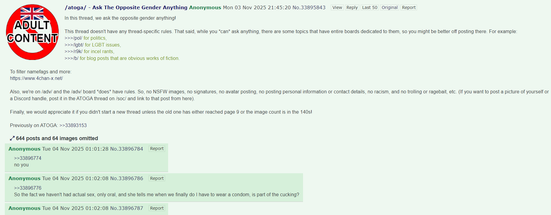 In this thread, we ask the opposite gender anything!This thread doesn't have any thread-specific rules. That said, while you *can* ask anything, there are some topics that have entire boards dedicated to them, so you might be better off posting there. For example:>>>/pol/ for politics,>>>/lgbt/ for LGBT issues,>>>/r9k/ for incel rants,>>>/b/ for blog posts that are obvious works of fiction.To filter namefags and more:https://www.4chan-x.net/Also, we're on /adv/ and the /adv/ board *does* have rules. So, no NSFW images, no signatures, no avatar posting, no posting personal information or contact details, no racism, and no trolling or ragebait, etc. (If you want to post a picture of yourself or a Discord handle, post it in the ATOGA thread on /soc/ and link to that post from here).Finally, we would appreciate it if you didn't start a new thread unless the old one has either reached page 9 or the image count is in the 140s!Previously on ATOGA: >>33893153