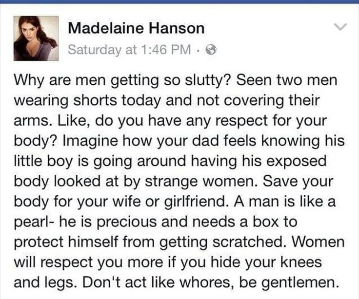 Ironically business or wedding dress clothes all require pants, closed shoes and covered shoulders for men but not women, but go on about how "opressed" you are