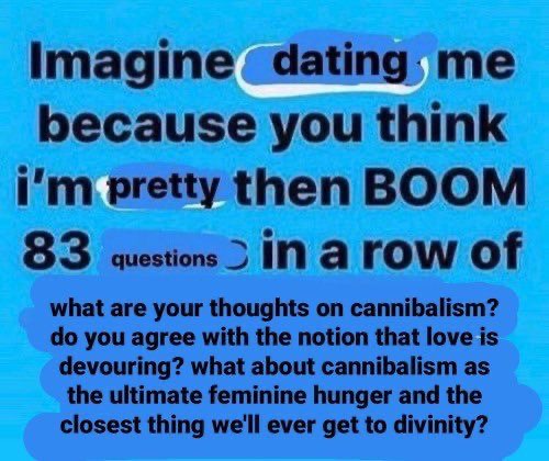 >>34032348in general I'd say wanting to be vored is less concerning for a partner, even though it does seem like a bit of a mental health red flag wanting to vore others tho seems like a bigger red flag to mewanting to be ingested and annihilated for the sake of total devotion and merging seems almost poetic in an erotic way, but if you wanted to cut up girls and make spaghetti bolognese out of them, that would be more problematic