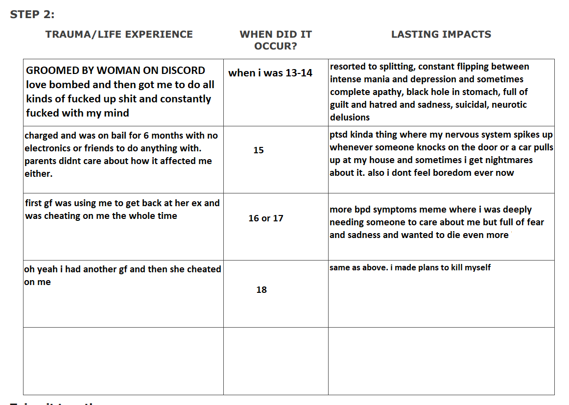 Also: step 2 may not even be possible depending on your psychological profile. Autism + emotional blunting obliterates your narrative ability.