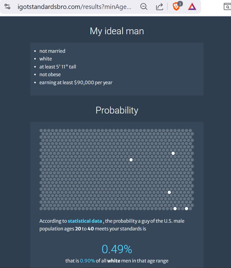 Look check this out.I'm not in the US however my income and heigh transfer accross because obviously height is the same and income transfers across to currency exchange rates.I'm basically in the top 2% in the US and even less in my country. Mids reject me, they're incredibly delusional.I actually had one woman say "I have high standards they have to make as much as my dad" ah because your boomer father is a fair comparison to a man 20-30 years younger in a different economic environment.
