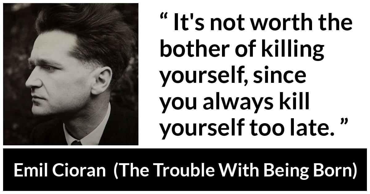 >Because my theory of suicide is that one shouldn't kill oneself, one should make use of this idea in order to put up with life. So, it's something else, but they've attacked me, saying this fellow makes the argument for suicide and doesn't do it himself. But I haven't made such an argument. I say that we have only this recourse in life, that the only consolation is that we can quit this life when we want to. So, it's a positive idea. Christianity is guilty of leading a campaign against this idea. One should say to people, "If you find life unbearable, tell yourself, 'Well, I can give it up when I want to."' One should live by way of this idea of suicide. It's in Syllogismes where I wrote that sentence: "Without the idea of suicide, I would have killed myself from the start." (Excerpt from Ciorans interview with Jason Weiss)