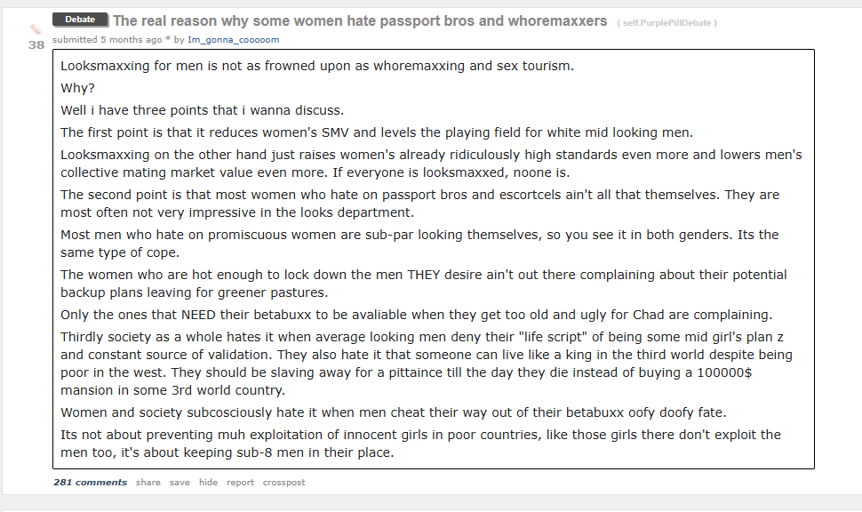 Ask yourself this.How many foods would a single moid give up for a gf?How many foods would a single foid give up for a gf?Which list is longer?There's your answer.