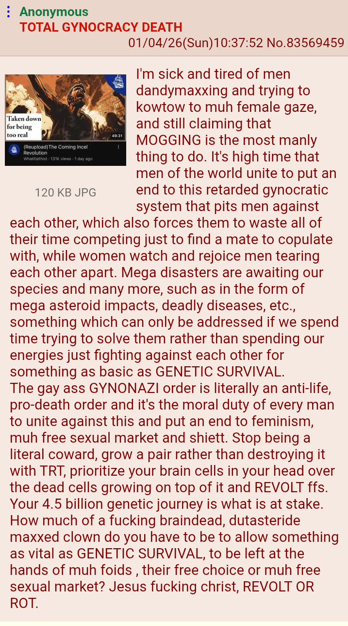 >>34254420real life organization and mobilization of incels of course. How do you think feminism even became institutionalized & entrenched hard in soiciety? Men must start being incredibly nepotitstic to blackpilled, incel sympahtising men and blatantly start discriminating foids & simps in workplace and get them fired in whatever ways they can. Incels must start running society so they can have leverage and eventually revolt.