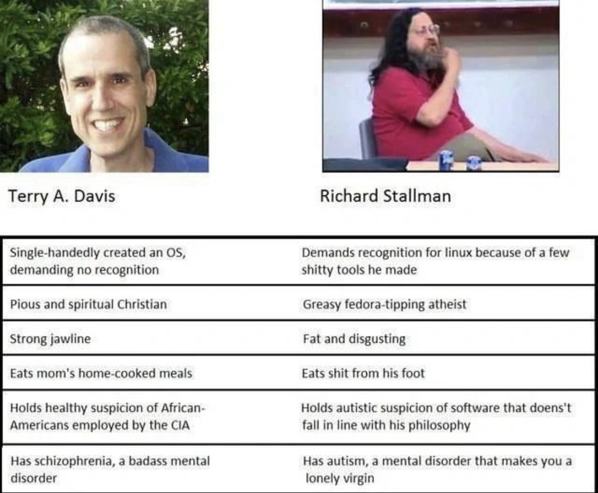 >>34345667Stallman's contributed so much, if he was as greedy as Bill Gates he'd be the richest man alive.But he prefer to sleep on a mattress in his MIT office instead.Of course foids will simp for the mentally ill retard with his useless ShitOS who nobody uses.