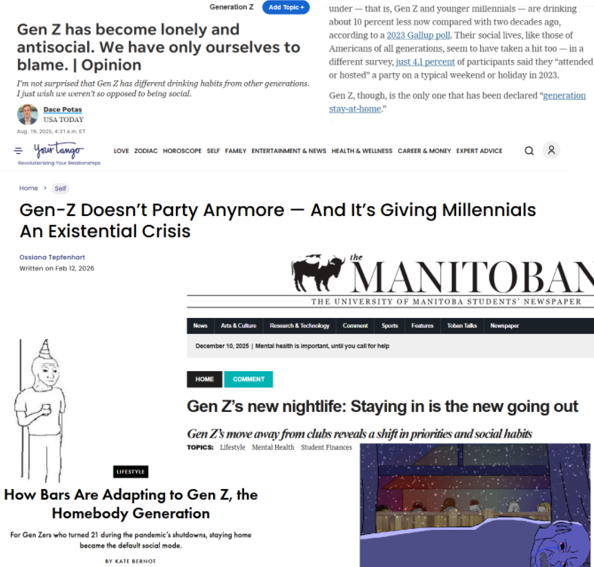 Zoomers are broke and either live with their parents or in an apartment with 5 other pajeets. After high school unless you're at a big party uni the party scene dries up for the next 10 years and all that's left are bars clubs or smaller get togethers at whoever's place