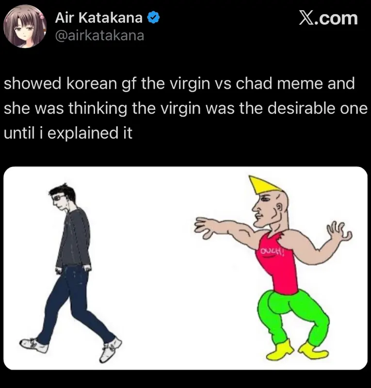 >>34374089I find it super interesting how many of these "women don't you feel bad you don't look like x?" posts populate 4chan. Its so common I expect to see two or three new ones every day.It makes me wonder how much female jealousy is just a weird male social construct meant for their entertainment. When a woman is picked over me I feel nothing more than mild annoyance because I know I have far more options for men to date.