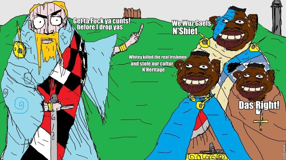>>34387190>>34387481nah but seriously, I do sympathise with you and american negroes. That is tough, having your culture and heritage ripped from you like that and being descendants of slavesI kind of know how you feel. I'm Irish myself in northern ireland and i'm 85% gaelic irish and 11% Scottish and 4% Norwegian. So I definitely have some planter/ulster scot blood, but how much is debatable. Ulster and Scotland are gentically close and the norse gael admixture would had been there before the plantation, so I could be more Irish than the result would say. But the fact that I have blood of my colonisers really is demoralising. I don't want to be part them'onsbtw, Scots-Irish and Gaelic irish are two different people. Scots-Irish are the coloniser british. They colonised Ireland, particularly Ulster backed by the English and then many of them went to america later. So if your test is showing native irish, then that is very peculiar. Usually it would be "Scots Irish"But sure look, you're 64% nigga. That's worth something