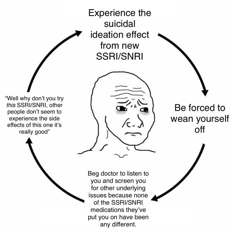 I’ve tried so many ssris they don’t do shit for me it’s like taking morphine while getting your leg actively burned off. I’m on the pill which is meant to stop my periods, stop the pmdd cycle. I missed one pill and everything has gone to shit in 72 hrs.