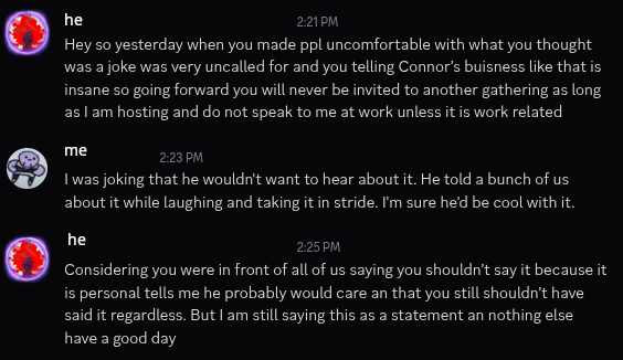 Then the next day, the host messages me on Discord saying that one story I told was "insane" and that it was "uncalled for". I'm not going to be invited to any events if he's hosting, and he doesn't want me talking to him any more.