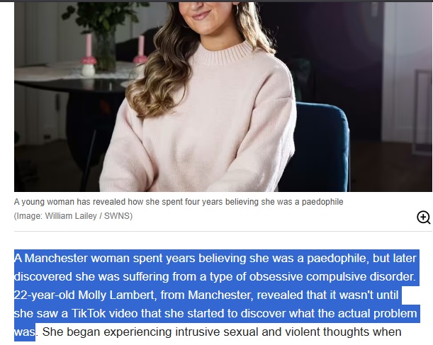 >>34411875she's talking about how she's not a pedophile, she has P-OCD, as in P (paedophilia)-OCD, a quirk that makes her constantly think intrusive thoughts about children. Regretfully, she suffered for years before she watched a video on TikTok about it. Look it up!
