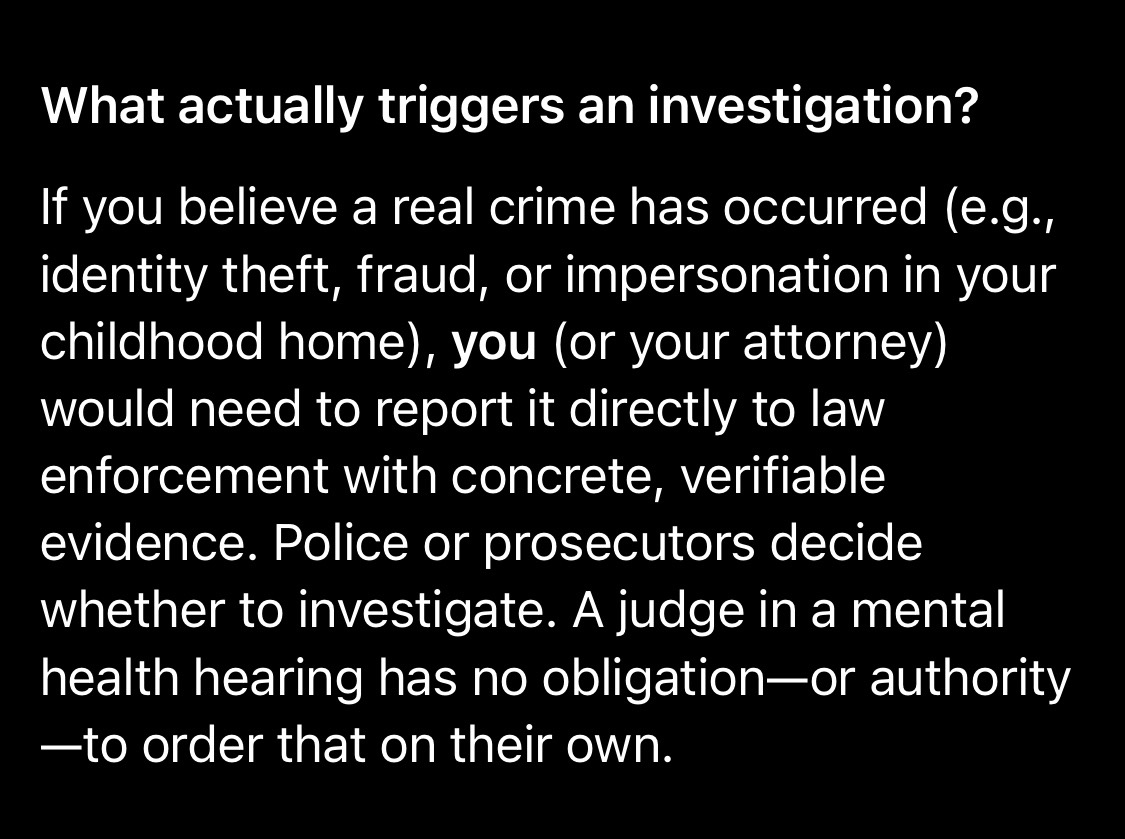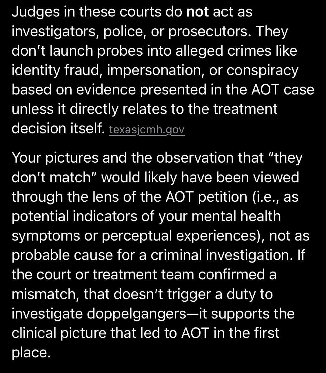 I’m expected to speak to a superior court judge every other week for “assisted outpatient treatment” with consequences of hospitalization if I fail to do so too many times according to the independent research I have done and nothing remotely enlightening or clear on the matter from any of the members of “aot”. On march 18th 2026 this superior court judge finally shared their opinion regarding the different photos of “derek” which I provided and they agreed with me that the pictures don’t match. I expressed my concern about how serious this could be and their only idea to proceed forward is by issuing more dna tests. My response was sure we could do that but it doesn’t really explain the doppelgängers. I took a third party dna test and pictures of the individuals who took the test as well at the dna testing office April 2025 and they matched yet there continued to be no explanation for the doppelgängers. I don’t understand why. The superior court judge told me that “aot” is only welcome to people who agree to ingest whichever drugs are prescribed by a doctor and I told them that I refuse to do so. They then asked if I could do something else for them. The superior court judge said that they want me to trust them and asked me to trust them. I told them that I can’t. I was then sent to the mental hospital again immediately after. Today my public defender for “aot” informed me that this superior court judge refuses to provide any more help regarding the pictures that I provided to her if I don’t agree to consume prescription drugs. We will be meeting on April 14th to discuss my departure from “aot”.