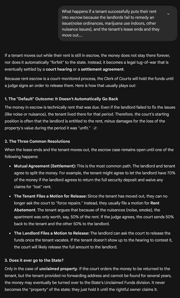 >>34425038According to grok, if you manage to get your rent into escrow and they never fix it, you can manage to get a portion of it back if they never fix their shit all the way until your lease ends.