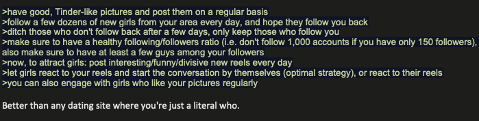 Have you found success treating Instagram like a dating app? I saved this advice a bit ago and found it really time consuming and not really working as well as dating apps
