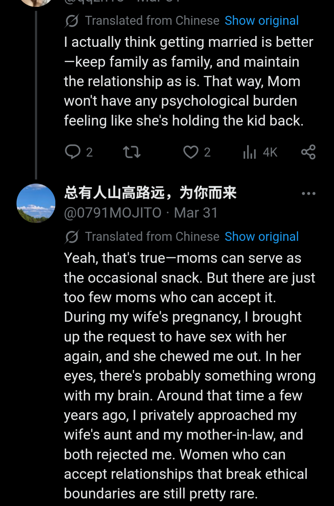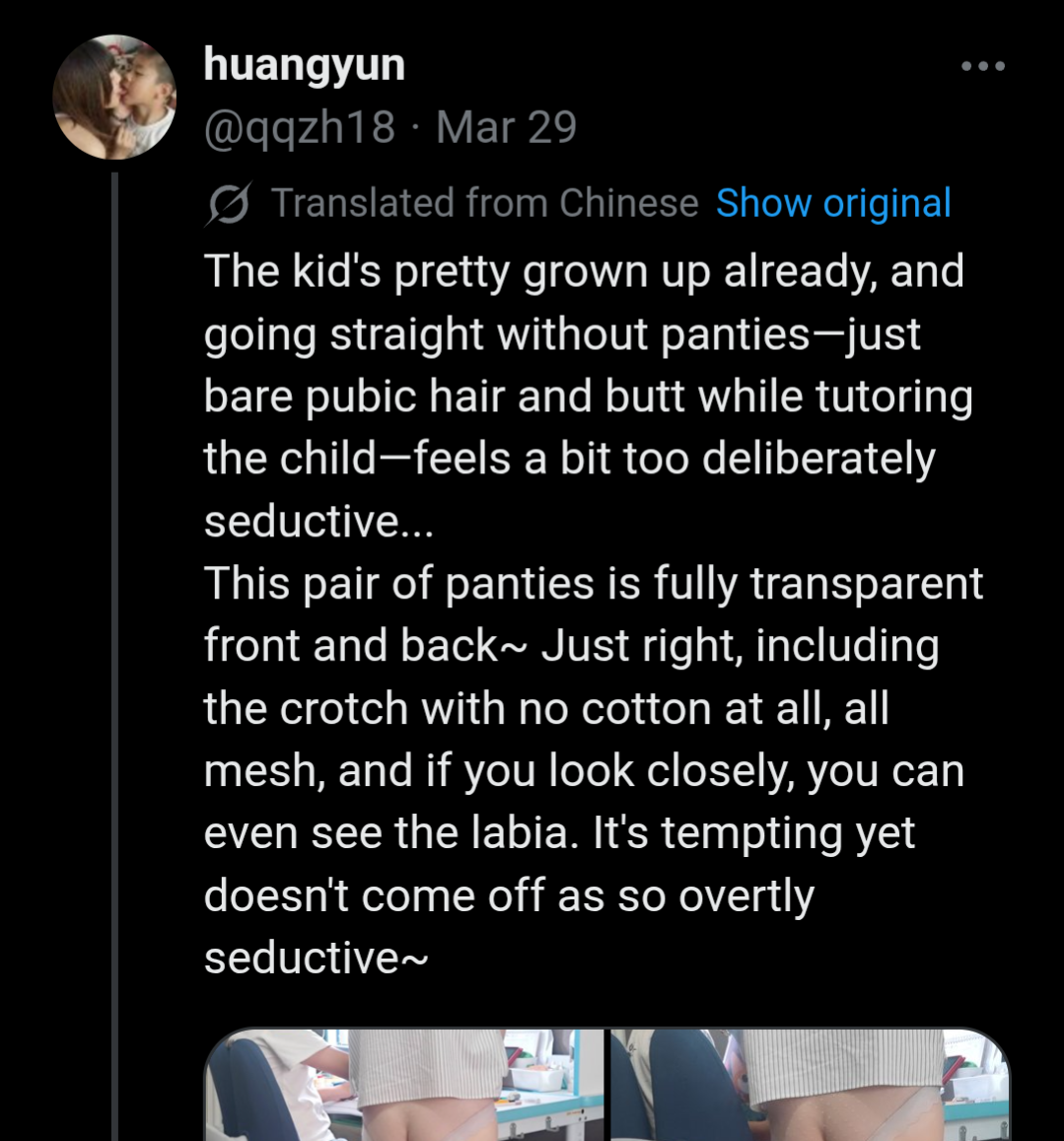 >>34451086found some really hot anecodotes from a Chinese dude on Twitter..."Seeing this. It really gives me that déjà vu from the son's perspective in those incest novels. My parents are rural folks, and when I was little, they had no concept of avoidance, so I grew up looking at my mom's naked body, and I've always wanted to truly fuck her. When I was in middle school and finally rubbed against her pussy, she realized I had sexual awareness, so she started avoiding me. If you guys can accept incest, then your son is very fortunate—he can fuck his own mom.If my mom had the same mindset as your wife, I reckon I probably wouldn't get married. I'd keep having sex with my mom forever. It's a pity that now she's on guard against me; she knows I want to fuck her, so she won't stay alone with me at home anymore."https://x.com/0791MOJITO/status/2038804901355270200wild.