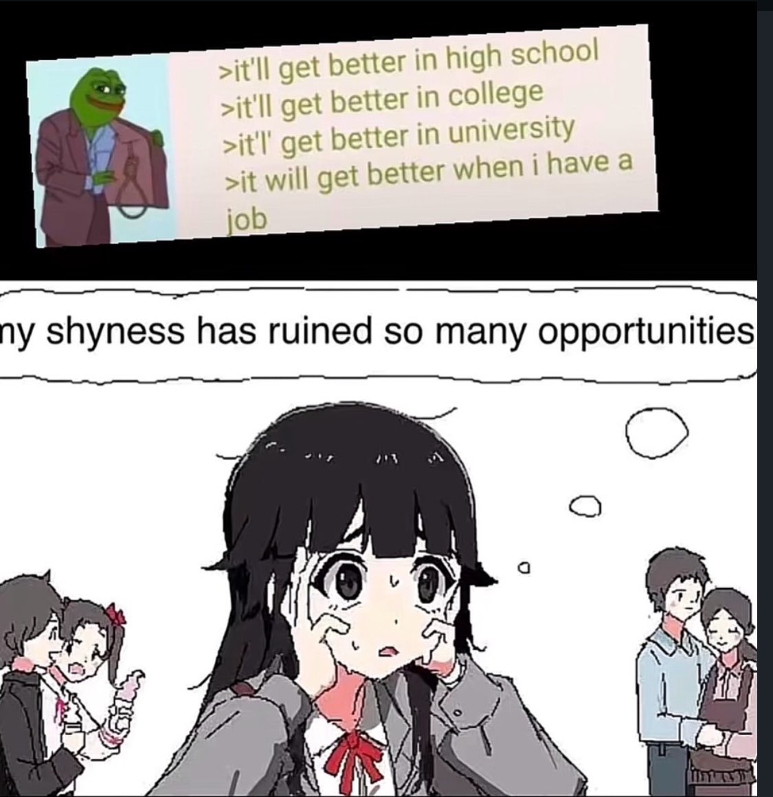 >thought I finally found a nice shy girl that fits my personality perfectly >saw her gross self-harm scars when she took off her sweaterThere's always a catch