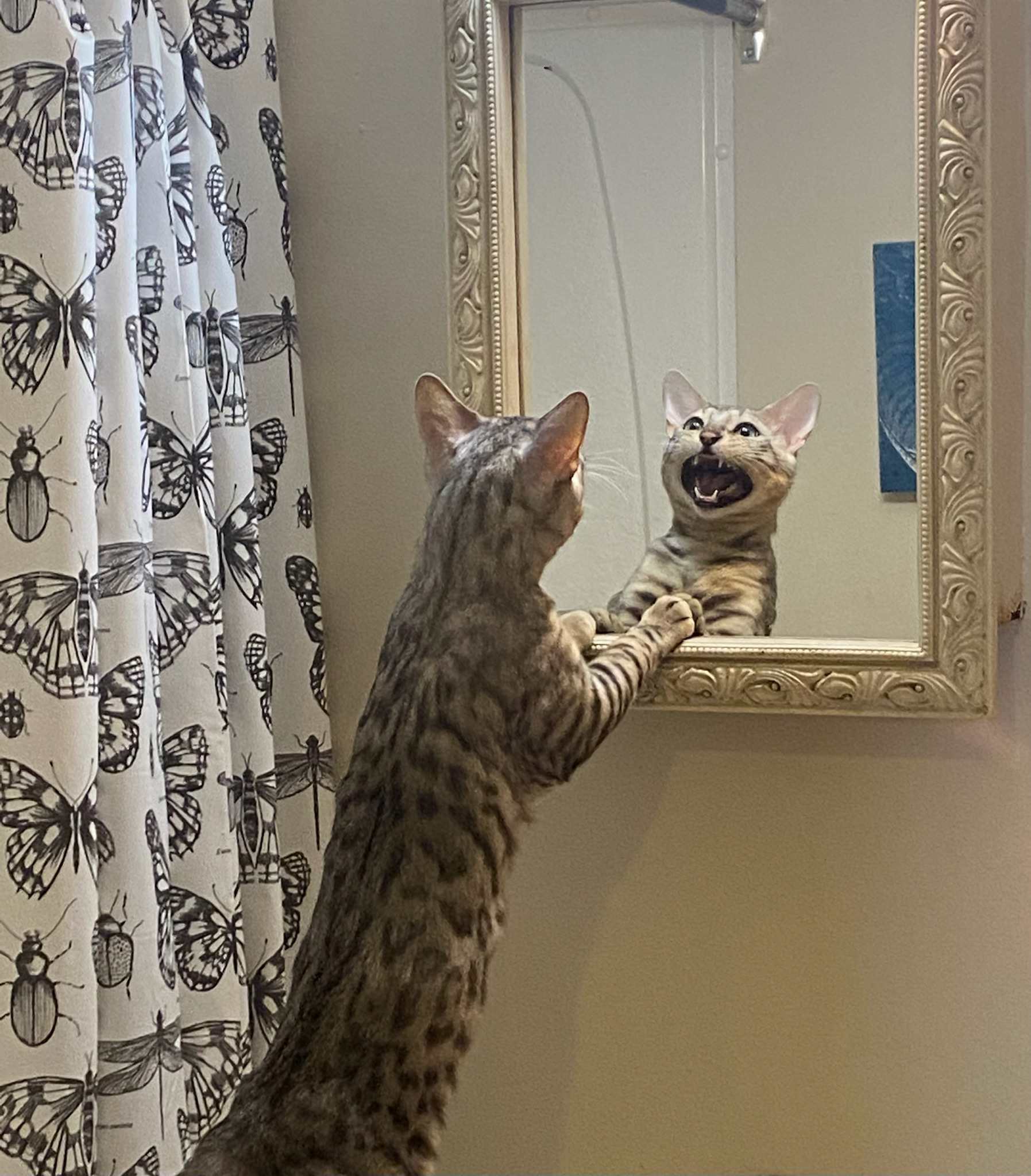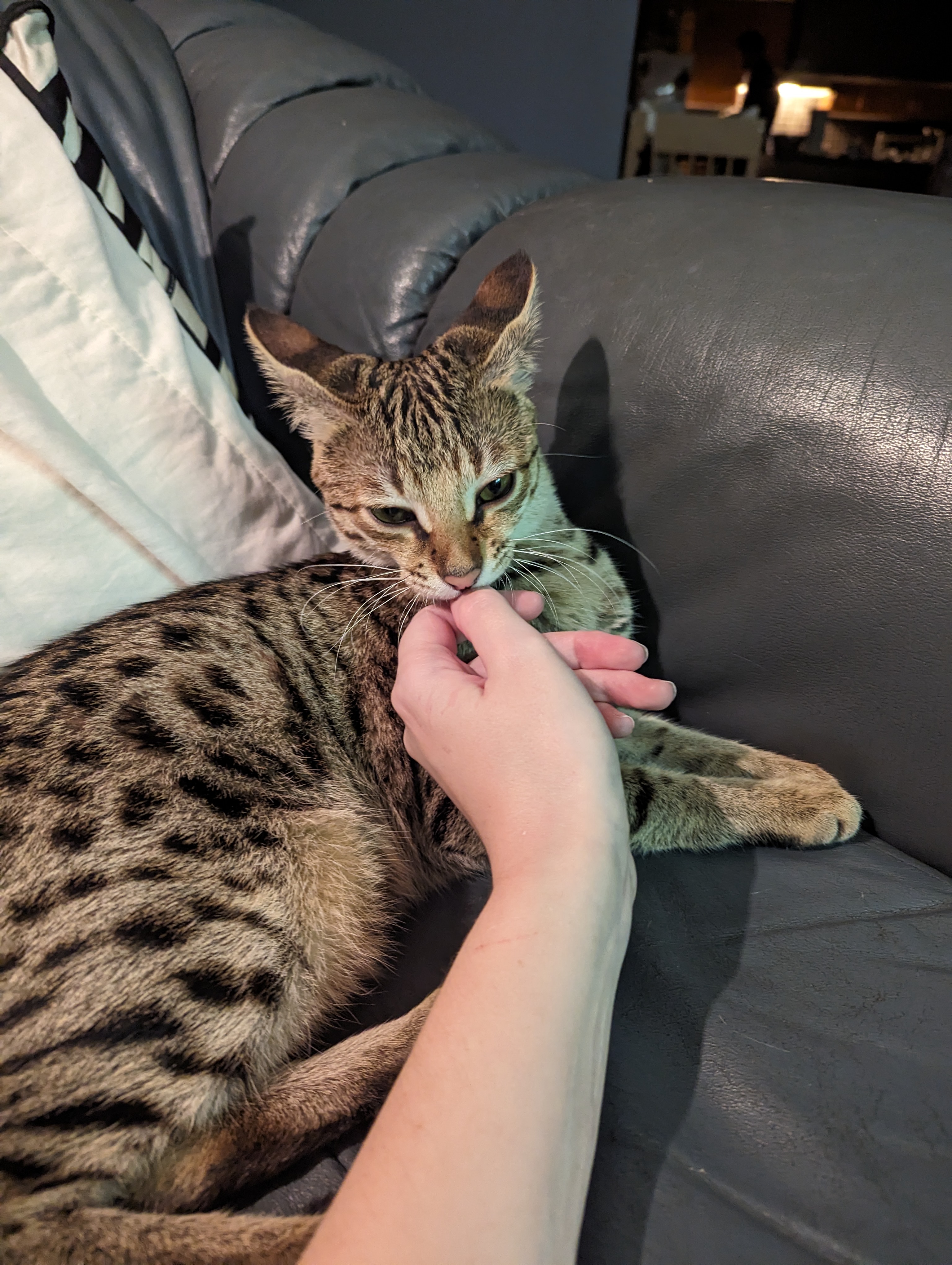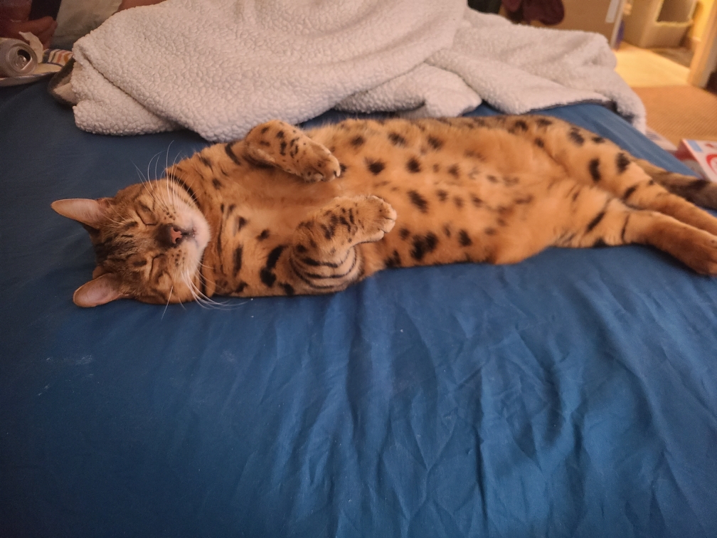>>5054609Yeah, not glittery as the other bengal but way more friendly. Loved to sit on top of doors and climb in the closet to dive bomb me in the night when I slept. My wife got him for free when he had his balls and he was a hellion, pissing and screaming everywhere. Gave him the snip and he turned into an A+ lad.