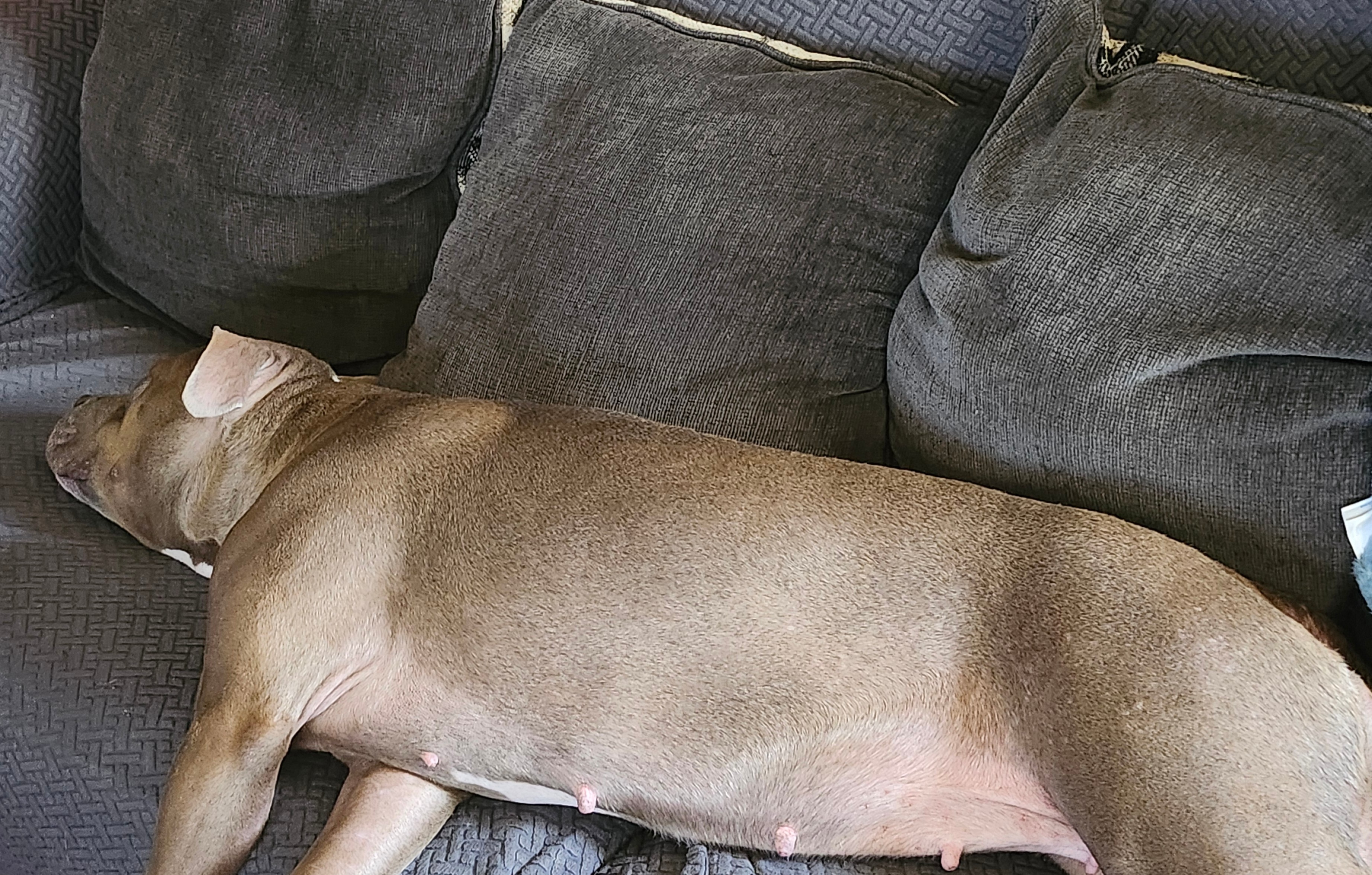 Also should he be on large bread dog food? He was on large bread puppy food, but I thought pitbulls were considered large bread dogs when I got him. When he was a year and a half I switched him to normal adult dog food (Iams mini chunks, he was on Iams large breed puppy food as a puppy).