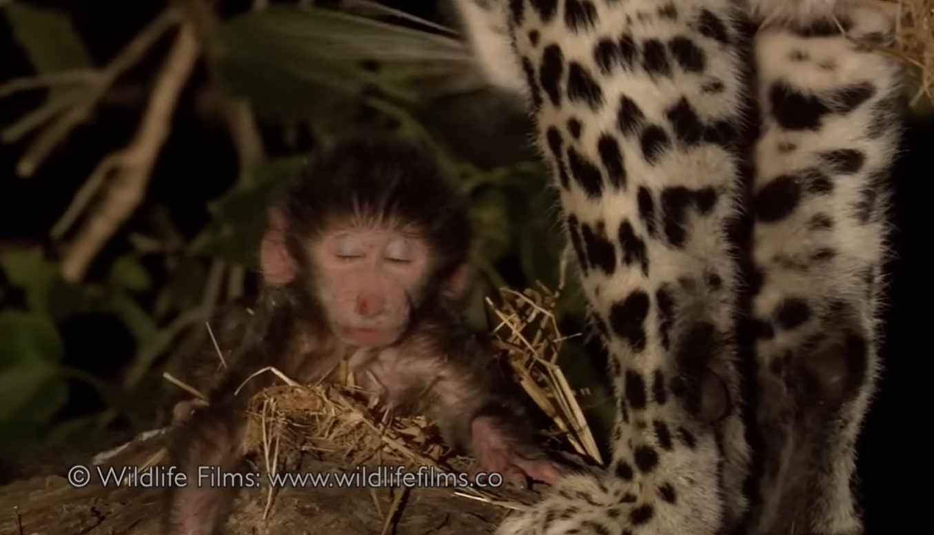 Context: the leopard killed this baby babboon's mother, but when it found the baby, it was protective of it (mothernal instincts? maybe it found it "cute"?), took it up a tree, and left it there. The baby died alone during the night.