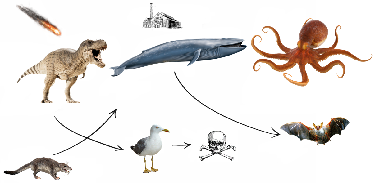 >Dinosaurs dominate terrestrial megafauna>Rapid climatic disruption occurs>They persist by contracting into an aerial niche as avian dinosaurs>Mammals later dominate terrestrial ecosystems>Climatic disruption occurs again>They persist by contracting into smaller, specialised niches such as bats and rodents>Cephalopods then undergo adaptive radiation, filling the vacant macroniches left by mammalsWhat would this look like, how long would it take, and how large or complex could they become?Mammals were unable to reach non-avian dinosaur scale due to lower atmospheric oxygen, denser skeletal structures, and the energetic cost of large, metabolically expensive brains. Cephalopods possess extremely high neuronal density and a distributed nervous system, with significant cognitive capacity relative to body size, as well as no bones, so would they struggle even more to reach larger sizes?