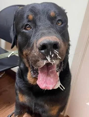 my dog is a dumb bastard who won't stop trying to be friends with porcupines