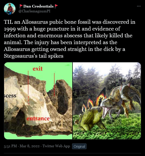 Yeah, and then the defining injury that killed an Allosaurus was an infected toe.