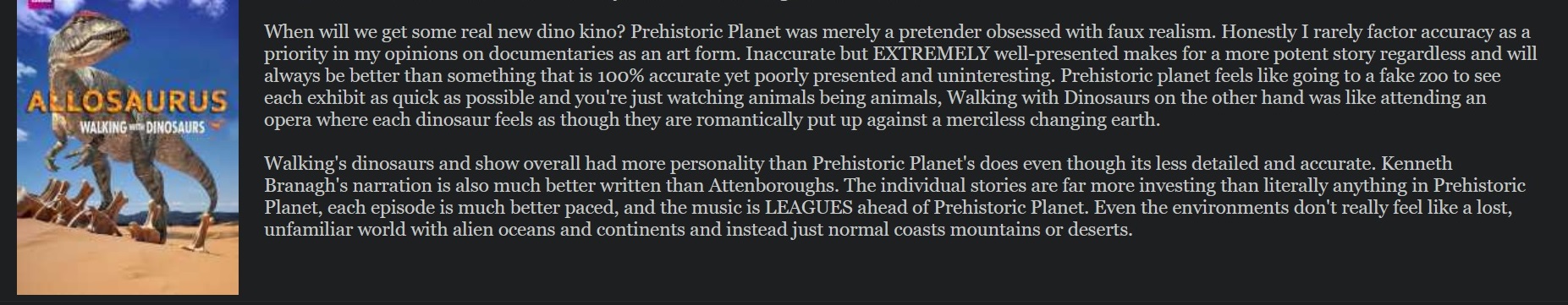 There's a lot that makes it great but something I mentioned in thread about Spielberg's paleodoc is that walking with dinosaurs is really tragic and brutal. Despite being a documentary the storytelling is amazing and it feels real because it doesn't pull it's punches. It doesn't pander to it's audience, it's uncomfortable to watch. Modern nature documentary's are afraid to alienate their audience like this. Nature docs are designed to be family friendly, with children as their core demographic. Even though we probably watched walking with as kids, it's incredibly bloody and violent, it's shocking which makes it an incredibly memorable watch.I think they did a really good job with the dialogue too, it never feels like you are being babied with the most laborious patronising dialogue we've come to expect in other paleodocs. It was made with respect for it's audience and treats you as an intellectual.