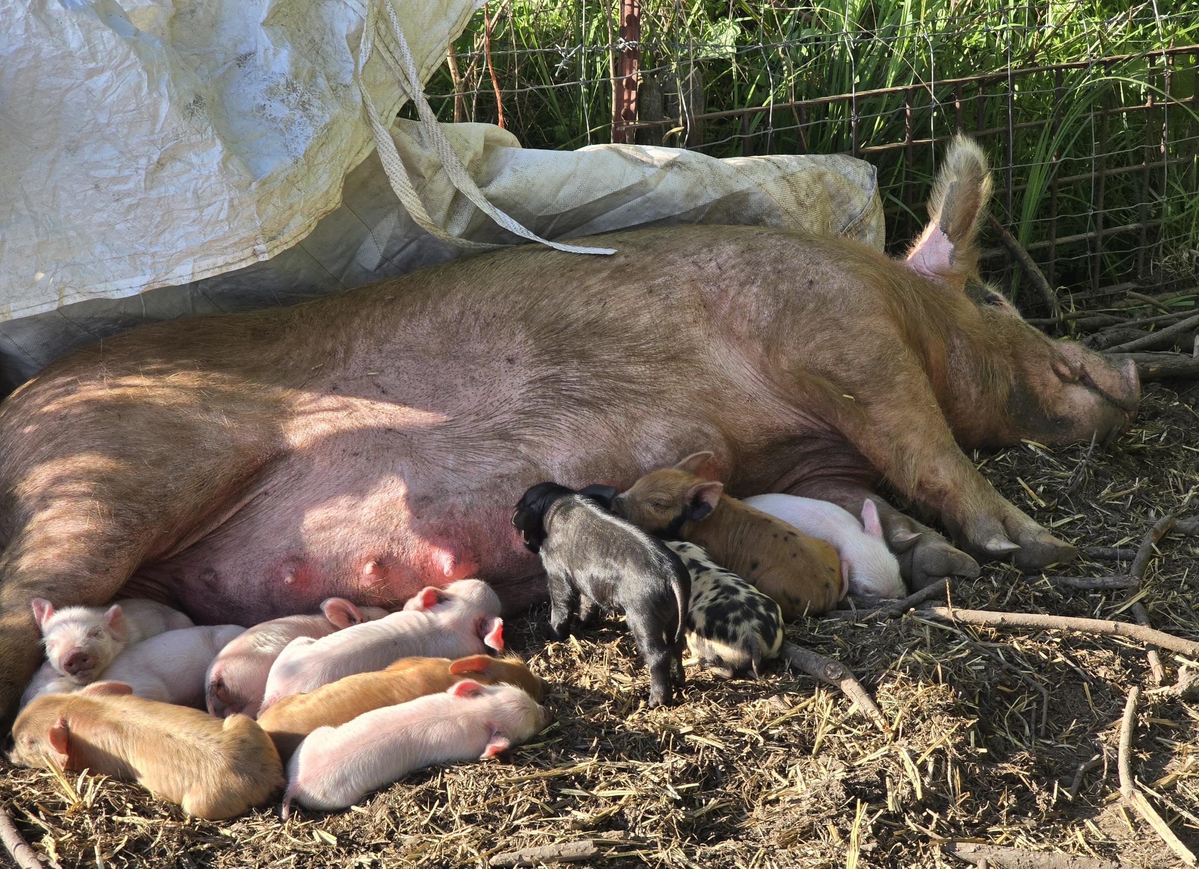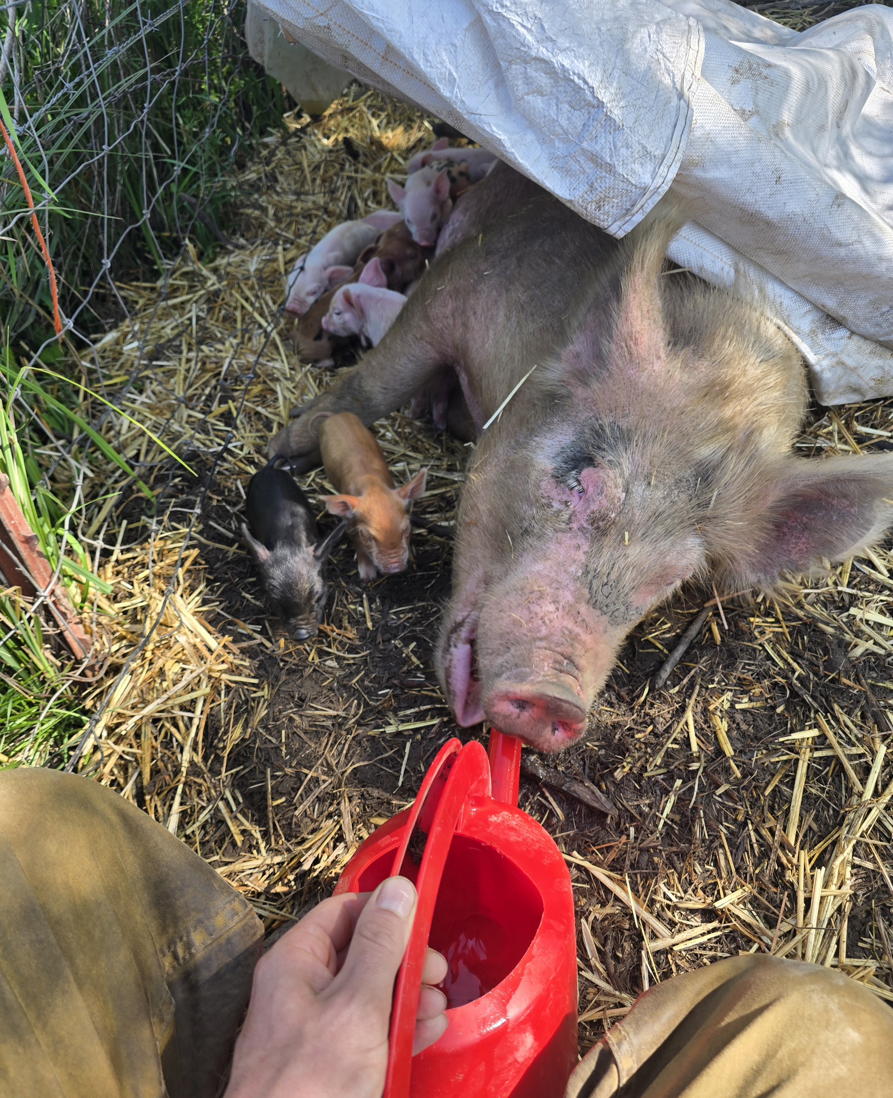 12 piglets total. Everyone survived the night. I think this was her first birth. Seems to be a pretty good mom.For the first few days the momma pigs just lay in their nest all day so you need to bring them water and food. The watering can is ideal for this. She will chug the whole thing multiple times per day.The less a sow needs to get up for any reason the better because laying back down always has the risk of accidentally crushing the piglets.