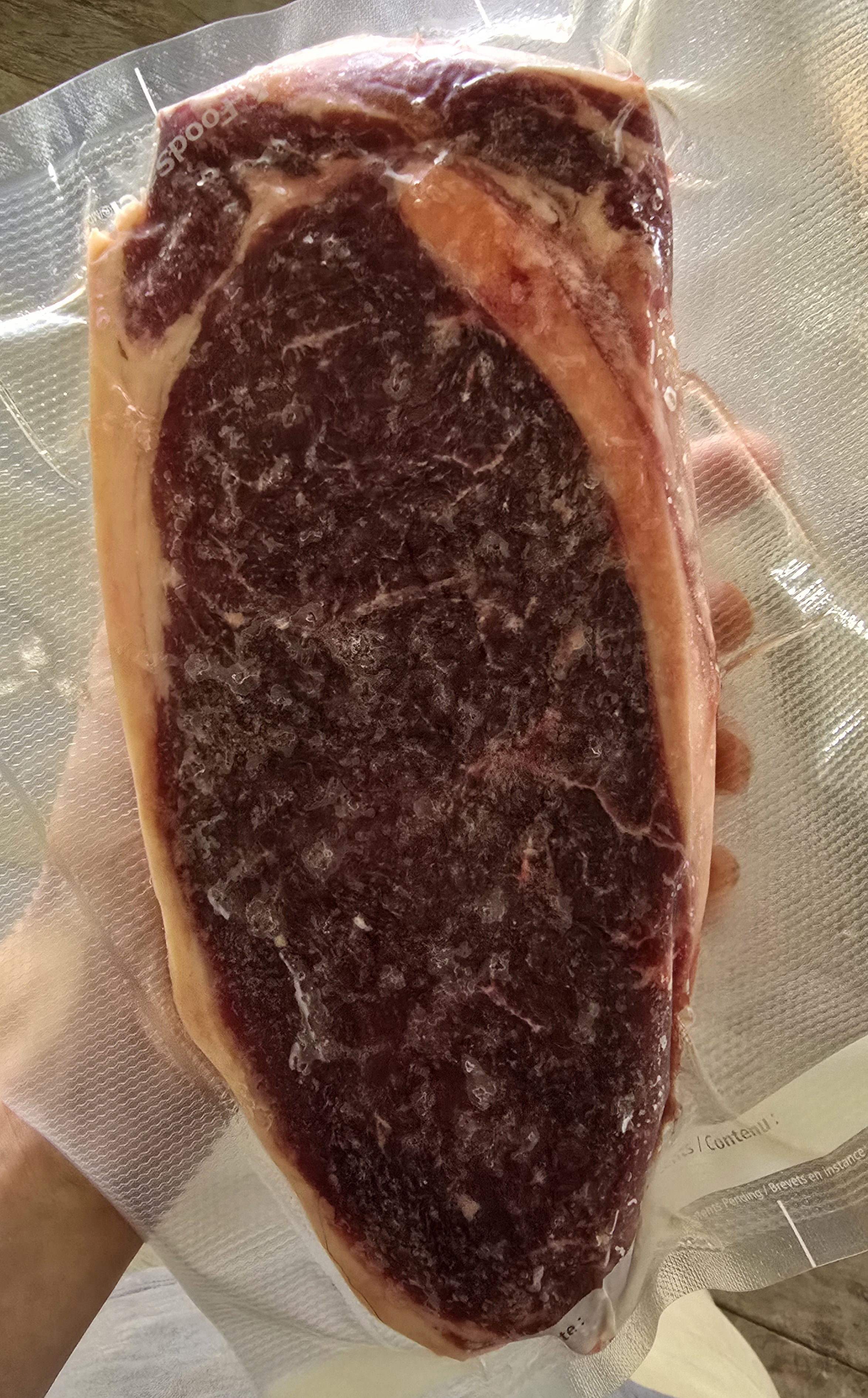 Picked up my beef today. 643lbs total. All in I'm somewhere between 5-6 dollars/lb in terms of feed and butchering costs. 181lbs of ground beef, six bags of bones, and the rest is steaks, roasts, and stuff for grilling. The meat straight out of the freezer bags has an aroma of grass and milk. Really nice smell.Bull meat is always going to be leaner than steer, but apparently the flavor is much stronger. For a 2 year old grassfed bull this is relatively decent marbling.After sous vide for 3 hours @129F I'm going to fire up the grill for the final sear. Will post results.