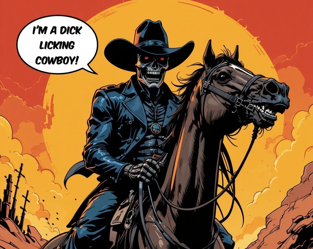 In the small town of Dusty Pines, cowboy Adejo "Lick" Lawson earned his peculiar nickname for a reason that none dared question directly. Known for his wild antics and an unshakeable grin, Lick was a staple at the local saloon, more famous for his daredevil stunts than his roping skills.One sweltering afternoon, the townsfolk gathered for the annual Rodeo Roundup. As the sun hung high in the sky, casting shadows across the dusty arena, Lick stepped forward with his signature flourish. Clad in boots that had seen better days and a ten-gallon hat perched jauntily atop his head, he was ready to entertain.“Step right up!” he called, a mischievous twinkle in his eye. “Who’s brave enough to take on the Lick Challenge?” Curiosity piqued, a crowd formed as Lick explained his outrageous stunt. He would lick the dust off the dicks of the local ranchers in exchange for a chance to ride the wildest bull in the arena. Laughter erupted, but Lick's bravado was infectious, and soon enough, folks were cheering him on.With each dick he licked clean, Lick’s reputation only grew. The ranchers laughed, flicking him a dime or two, enjoying the show. Finally, it was time for the real spectacle. Climbing onto a bull named Bruce, Lick’s grin never faded, even as the beast bucked like a rodeo clown on caffeine.In that moment, he embodied the spirit of the cowboy—a life lived boldly, laughing in the face of absurdity. Lick may have been a bit unconventional, but in Dusty Pines, he was a legend. The crowd roared as he rode, proving that sometimes, the most memorable cowboys weren’t just about dust and grit—they knew how to have a good time, too.