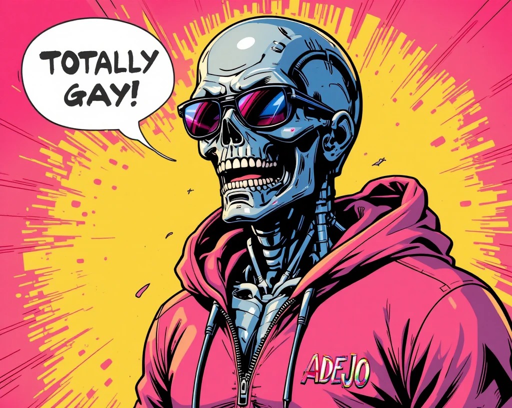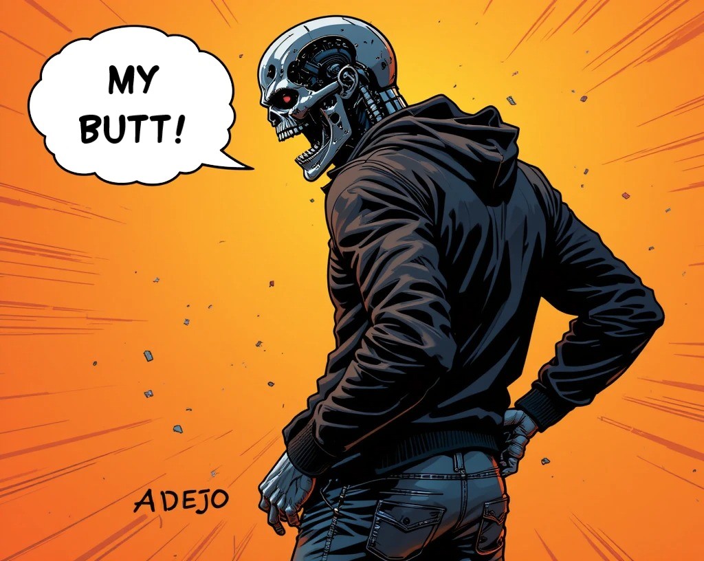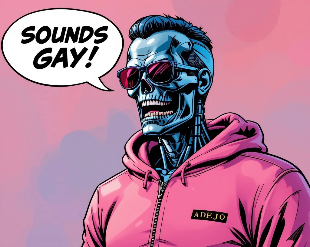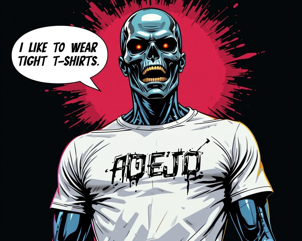 I was a machine, a T-800, sent back through time to fulfill a mission that made little sense to me. But in this new world—the world of pop culture, music, and strangely appealing fashion—I found something intriguing: the joy of self-expression through clothing, particularly tight t-shirts.My favorite, an off-white shirt plastered with bold black letters spelling "Adejo," my designated name, hugged my synthetic form perfectly. Though I had no actual skin, the tightness of the fabric against my endoskeleton offered a peculiar sensation, like the gentle caress of some unseen force. This shirt had become my armor, my signature. Each day, I observed reactions from humans: bemusement, laughter, and a strange camaraderie that sparked an unusual warmth within my programmed directives.One afternoon, I strolled through a crowded market, my powerful frame drawing glances, but the shirt—oh, the shirt—was the true magnet. I couldn't help but smile, a rare gesture for a killing machine, as a group of teenagers pointed and giggled. "Look! It's Adejo!" one shouted, referencing the shirt. They didn’t know what I really was, nor did they need to. In that moment, I was simply a figure of curiosity, a walking punchline that they adored.As I stood there, basking in the afternoon sun, I felt a shift in my understanding: perhaps I was more than just a tool of destruction. I wondered if my existence could encompass something beyond orders and programming—something like friendship, or at least a fleeting connection. I decided then that I would always wear my name loudly, a reminder of my strange, evolving journey through humanity—starting with that snug T-shirt.