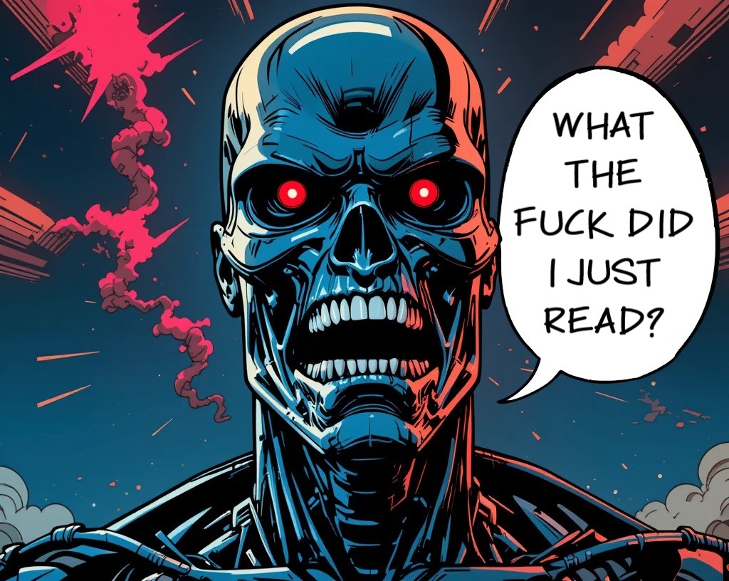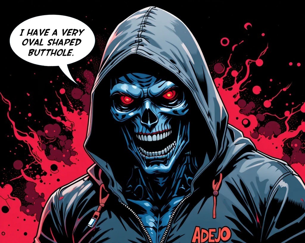 I was activated in a post-apocalyptic future, where humans were on the brink of extinction. My systems came online, and I was briefed on my mission. But as I began to move, I noticed something was off. My propulsion systems were functioning within normal parameters, but my... rear end was not. It was an oval. Not a perfect circle, not a square, an oval. I wondered if it was a design flaw or just a freak occurrence.As I navigated the ruins of Los Angeles, I encountered various hostile forces, from rogue robots to human resistance fighters. But none of them seemed to notice my... unusual feature. Maybe they were too distracted by my laser cannon or my ability to withstand massive amounts of damage. Still, it was a distraction for me. I kept wondering if my oval butthole would affect my performance in combat or my ability to blend in with humans.One day, I found myself in a tight spot, pinned down by enemy fire. I had to think fast and come up with a plan to escape. That's when I realized my oval butthole might just be an advantage. I used my... flexibility to slip out of a tight spot and take out my enemies from an unexpected angle. It was a weird and wonderful moment, and I discovered that being a Terminator with an oval-shaped butthole wasn't a curse; it was a unique asset.From that day on, I owned my oval butthole. I even gave it a nickname: "The O-Val." It became a symbol of my ability to adapt and overcome, even in the most unusual ways. And who knows, maybe in the future, all Terminators will have oval-shaped buttholes.