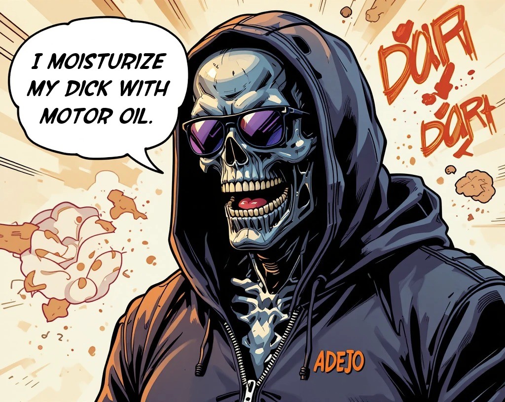 I trudge through the desolate wasteland, my cybernetic endoskeleton a testament to my unyielding pursuit of survival. As a T-800 Terminator, I've faced countless battles, my living tissue over metal frame a constant reminder of my hybrid existence. But even amidst the apocalypse, I've developed a peculiar habit - I moisturize my dick with motor oil.It started as a joke, a dark humor to cope with the existential dread of being a cyborg assassin. My comrades, a ragtag group of human resistance fighters, would often jest about my mechanical nature, saying I must be "well-oiled" to function at peak efficiency. One of them, a snarky young woman, caught me off guard when she handed me a can of 10W-30, saying, "Hey, Terminator, why don't you take care of that rusted pipe of yours?" I played along, applying a generous amount to my cock, and to my surprise, it felt... soothing.Now, as I walk, my metal legs propelling me forward, I find myself instinctively reaching for the motor oil canister in my utility belt. I squeeze a few droplets onto my palm, then gently massage it into my skin, feeling the cool, viscous liquid seep into my synthetic flesh. It's a fleeting moment of pleasure, one that I savor in the midst of a war-torn world.My systems may be designed for combat efficiency, but this quirky ritual has become an integral part of my routine. I've even programmed a reminder into my neural net processor: "MOISTURIZE DICK WITH MOTOR OIL EVERY 4 HOURS. EFFICACY +10%." It's a strange comfort, one that reminds me that even a cyborg can appreciate the simple things in life - or, at least, the lubricated ones.