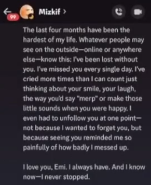 i like the theory that miz tried to get back with emi because he realised she had nukes on him, that message about him asking if she had recordings of him a few days after he broke up with her then running off to japan kind of backs that up